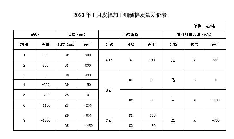 依据2022年12月的棉花公检质量数据、中国棉花协会棉花质量价差自动生成系统采集的棉花加工企业销售成交价、纺织企业监测点的采集数据以及当月的中国棉花价格指数,为引导加工期轧花厂进行合理配车,保证加工质量,并征求业内专家的意见,现对2023年1月《中国棉花协会国产棉质量差价表》做出如下调整: