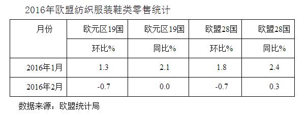 从纺织服装和鞋类零售看,2016年2月欧元区19国零售额环比下降0.7%,同比持平;欧盟28国零售额环比下降0.7%,同比增长0.3%。