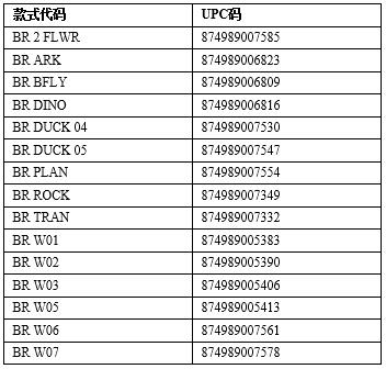 此次扩大召回的产品为100%棉制婴儿带帽浴袍,适合0~9个岁的婴儿,颜色有粉色、绿色、蓝色、白色或黄色,并配各种贴纸,包括火车、鸭子、鲸鱼、鲜花等。该款产品配和一双婴儿袜配套售出。此次召回产品的信息如下,