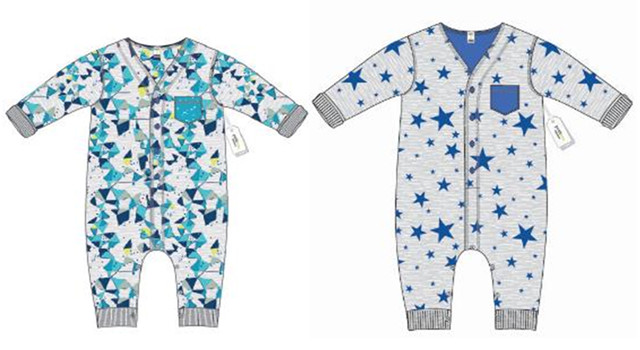此次召回的产品为PetitLemSignature的两款连体衣,长袖、类似睡衣,不带脚。该款衣服由浅灰色法国毛圈织物(100%棉)制成。衣服上印有小三角形或星行的蓝色图案。衣服胸部上有暗扣和蓝色口袋。款式代码为16SE09L346和16SE07L345。标签上印有款式代码。