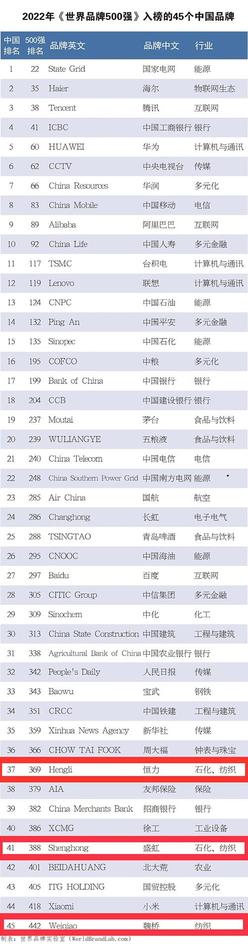 由世界品牌实验室(World Brand Lab)独家编制的2022年度(第十九届)《世界品牌500强》排行榜于12月15日在美国纽约揭晓。中国品牌入选数有45个,继续保持第四名的好成绩,其中表现亮眼的品牌有国家电网、海尔、华润、中国人寿、五粮液、青岛啤酒、周大福、中化、中国南方电网、恒力、徐工和北大荒。纺织行业共有三个品牌上榜,分别是恒力、盛虹、魏桥。