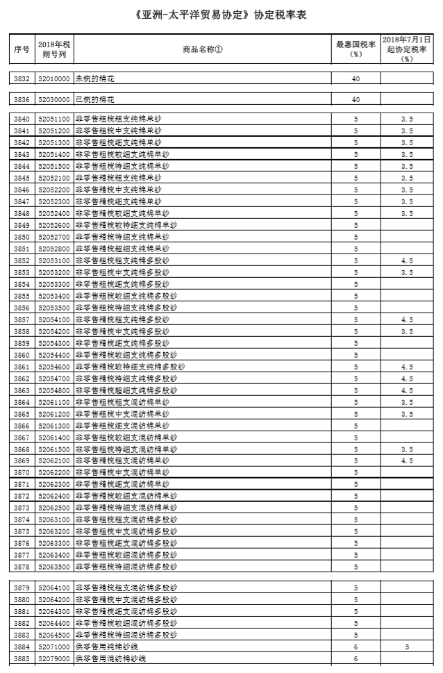 《〈亚洲-太平洋贸易协定〉第二修正案》棉花棉纱进口关税不变