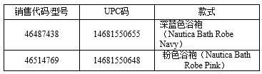 此次召回的产品为Nautica100%棉制婴儿带帽浴袍,适合0~9个岁的婴儿,颜色有粉色或深蓝色。该产品的相关信息如下,