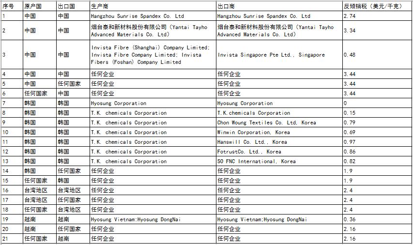 2017年3月24日,印度商工部发布公告称,对进口自中国大陆、台湾地区、韩国、越南的弹性纱线(ElastomericFilamentYarn)作出反倾销终裁,建议对中国大陆、台湾地区、韩国和越南的涉案产品分别征收0.48~3.34美元/千克、2.40美元/千克、0~1.90美元/千克、0.36~2.16美元/千克的反倾销税,详见下表。涉案产品的印度海关编码为54041100。